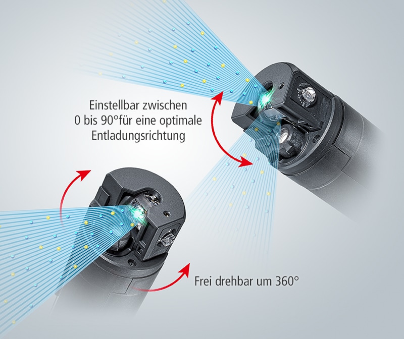 Das kompakte Gehäuse und die Düse sind jeweils um einen Freiheitsgrad drehbar, um so die Entladungsrichtung individuell anpassen zu können. Selbst bei engen Platzverhältnissen können Sie so den Ionenstrom optimal auf die