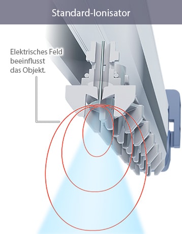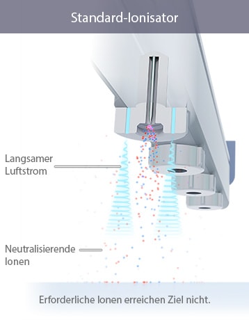 Das Ergebnis ist ein zehnfach besseres Ionengleichgewicht als bei Vorgängermodellen. Dies ermöglicht eine äußerst präzise elektrostatische Entladung. Somit werden Schäden durch elektrostatische Entladung minimiert und das Risiko von Fremdkontaminationen auf ein Minimum reduziert.