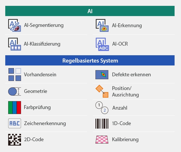 Wir bei KEYENCE entwickeln ständig fortschrittliche, firmeneigene Bildverarbeitungstechnologien. Unser Sortiment umfasst eine breite Palette von Produkten, die es uns ermöglichen, Lösungen für die zahlreichen Herausforderungen zu finden, die tagtäglich in Produktionsstätten auftreten. Zu diesen Produkten gehören sowohl intelligente All-In-One-Modelle als auch Steuergeräte mit hoher Geschwindigkeit für Matrix-, Zeilen- und 3D-Kameras. Je nach Situation wählen Sie, ob Sie AI-, regelbasierte- oder eine Kombination dieser Prüffunktionen einsetzen möchten. KEYENCE liefert den gesamten Umfang, der für Bildverarbeitungssysteme benötigt wird, einschließlich Objektive und Filter. Dies runden wir mit unserem Portfolio an Standard- sowie intelligenten Spezialbeleuchtungen ab.