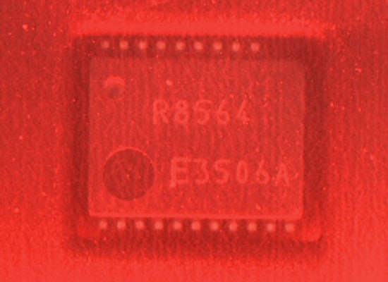 Im Folgenden wird ein Bildvergleich des Aufdrucks auf einem Chip im Trägerband gezeigt, der durch eine transparente Folie aufgenommen wurde. Der Kontrast ist bei roter Beleuchtung höher als bei blauer Beleuchtung, da Rot eine höhere Durchlässigkeit (geringere Streuung) aufweist.