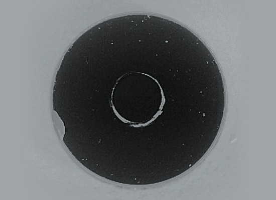 Selbst wenn mit reflektiertem Licht kein Unterschied erkennbar ist, werden die Fremdpartikel durch die Anwendung von Durchlicht von hinten auf das Prüfobjekt als dunkle Silhouette sichtbar.