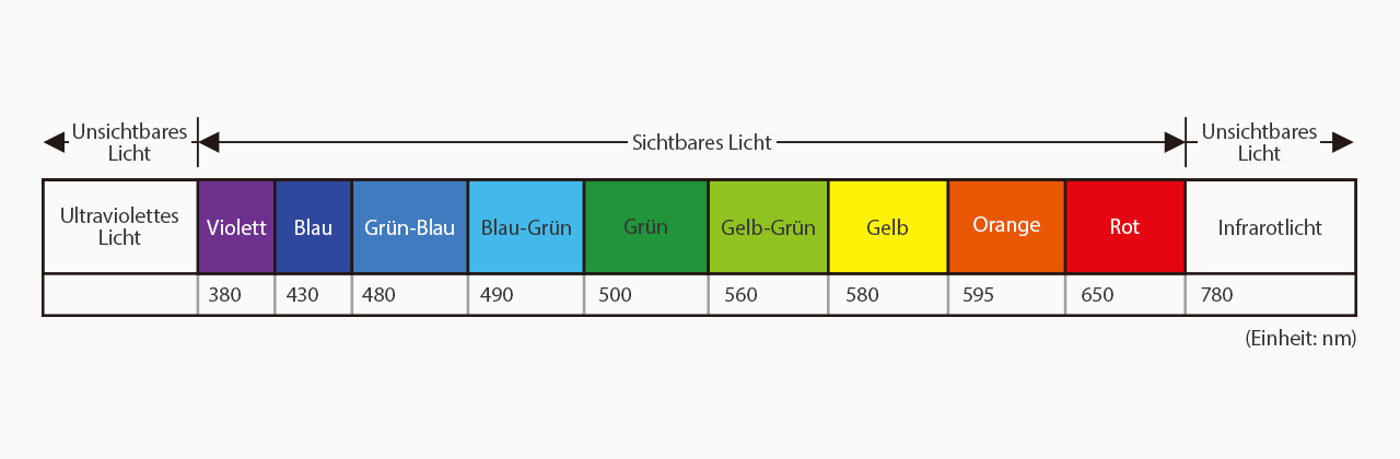 Licht unterschiedlicher Wellenlängen erscheint in verschiedenen Farben. Die Wellenlänge bestimmt die Eigenschaften einer bestimmten Farbe, wie z. B. leichte Durchlässigkeit (rotes Licht – lange Wellenlänge) oder starke Streuung (blaues Licht – kurze Wellenlänge).
