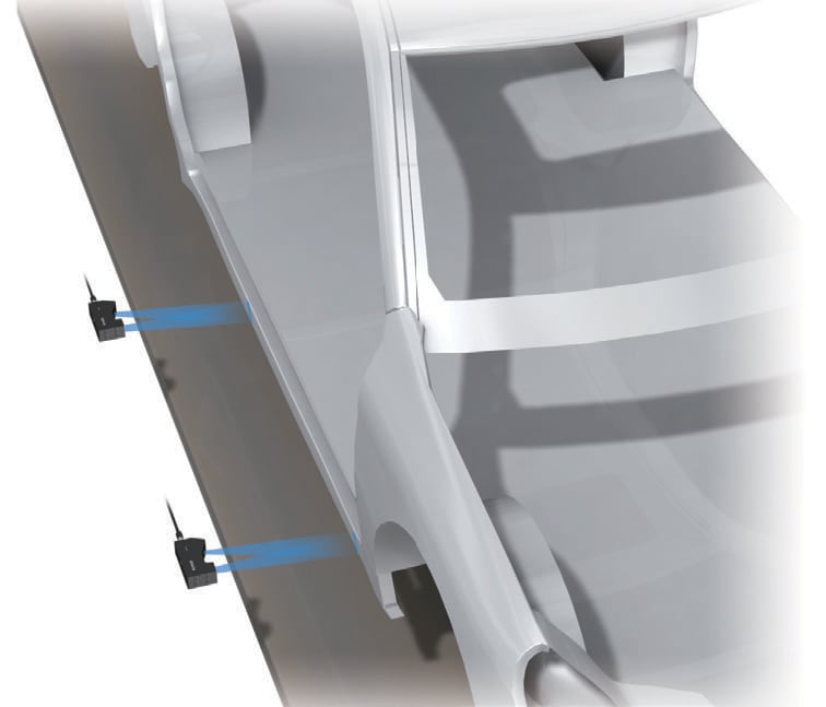 Die Modellreihe LJ-X8000 prüft auf Verformungen, die während des Schweißens entstanden sein können. Mit dem Fahrzeugboden als Referenz lässt sich beispielsweise der Steigungswinkel einer Säule messen. Die Modellreihe LJ-X8000 zeichnet sich durch eine sehr gute Umgebungsbeständigkeit aus, sodass sie sogar unter den extremen Bedingungen einer Montagezelle mit Schweißrobotern problemlos einsetzbar ist.