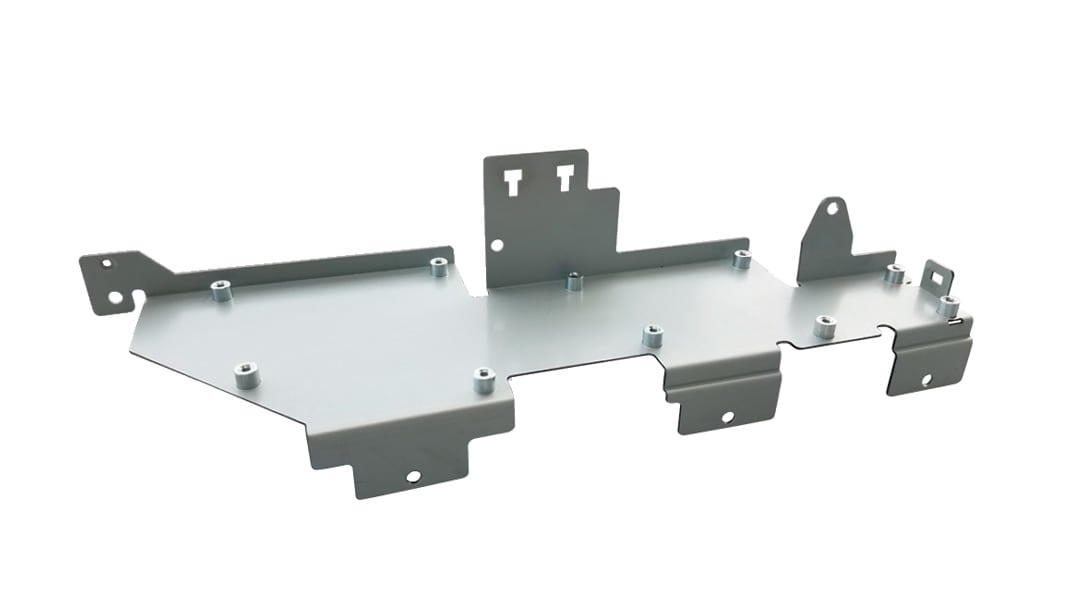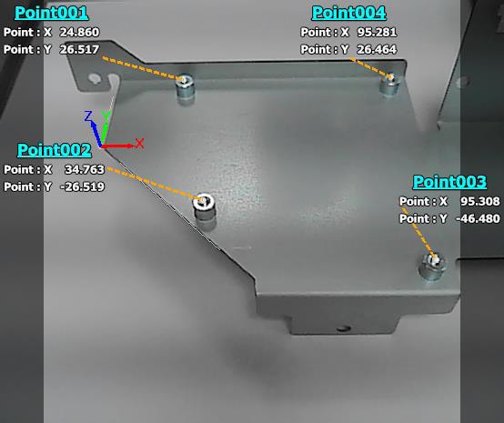 Der Abstand von einer virtuellen Linie (der Schnittlinie zwischen zwei Ebenen) zu einer Bohrungsposition kann gemessen werden. Die XY-Koordinaten einer Gewindebohrung auf der Metallplatte können gemessen werden.