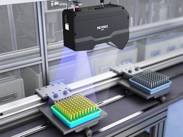 Die Modellreihe LJ-S8000 kann verwendet werden, um den Typ der Einspritzdüsen auf einem Transportträger zu identifizieren. Das breite Sichtfeld von bis zu 640 x 640 mm ermöglicht die einfache Erkennung unterschiedlicher Produkttypen. Hierzu muss lediglich das System installiert werden.