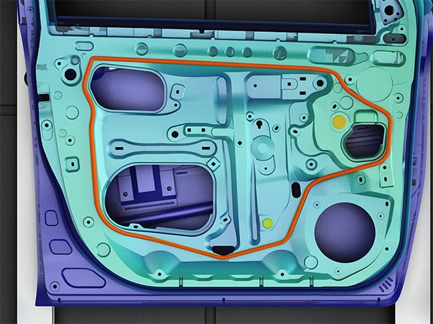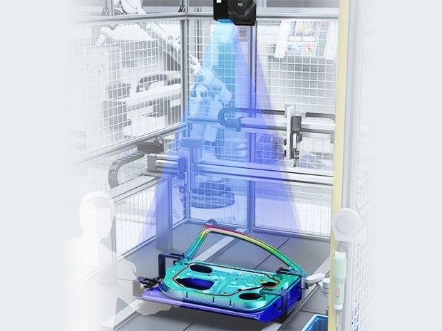 Die Modellreihe LJ-S8000 bietet ein maximales Sichtfeld von 640 x 640 mm für Messungen und kann 3D-Daten unabhängig vom Umgebungslicht oder der Farbe des Werkstücks erfassen. In nur einem Durchlauf können mehrere Werte, z. B. das Vorhandensein von montierten Komponenten und die Menge des aufgebrachten Dichtmittels, überprüft werden.