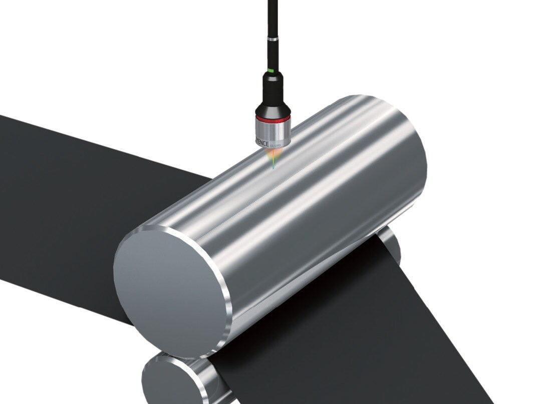 Rundlaufmessung von Walzen. Auch bei schnellen Produktionsprozessen kann der Rundlauf dank der hohen Abtastrate von 10 kHz stabil gemessen werden. Durch eine kontinuierliche Prüfung des Rundlauffehlers lässt sich die Beschichtungsqualität im Prozess verbessern.