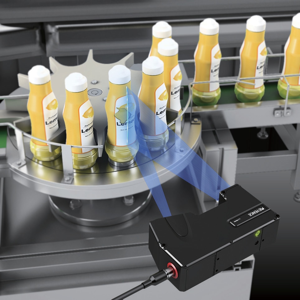 Für herkömmliche Kameras ist es schwierig, Risse in transparenten Schrumpffolien zu erkennen, die auf Flaschenoberflächen verwendet wird, was zu falschen Erkennungen führt. Anhand der Prüfung der Oberfläche mit dem Profilsensor der Modellreihe LJ-X8000 werden präzise Veränderungen der Oberflächenform erfasst, die durch Folienrisse verursacht werden.