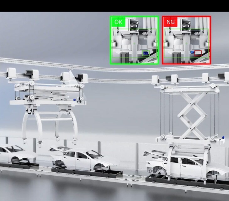 Eine Erkennung der Aufhängungsvorrichtung vermeidet verschiedene, mögliche Probleme, die durch das Lösen von Karosserien zu Staus führen können. Eine Überwachung mit einem Vision-Sensor kann diese Probleme von vornherein vermeiden.