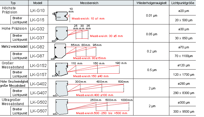 Die Triangulations-Laser-Distanzsensoren der Modellreihe LK-G5000 bieten ultraschnelle und hochpräzise Messungen für jede beliebige Anwendung. Durch den Einsatz modernster Hardware wie dem RS-CMOS und dem HDE-Objektiv liefern die Sensoren zuverlässige Ergebnisse für eine Vielzahl von Materialien, auch bei schwach reflektierenden Oberflächen. Diese Technologie sorgt für einen Sensor mit hervorragender Linearität (0,02 % von F.S.) und Wiederholgenauigkeit (0,005 µm).