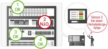 Bei auftretenden N.i.O.-Zustand können Sensoren und Bildverarbeitungssysteme entsprechende Signale, für die Verwaltung und Überprüfung aller Prozessdaten, ausgeben.