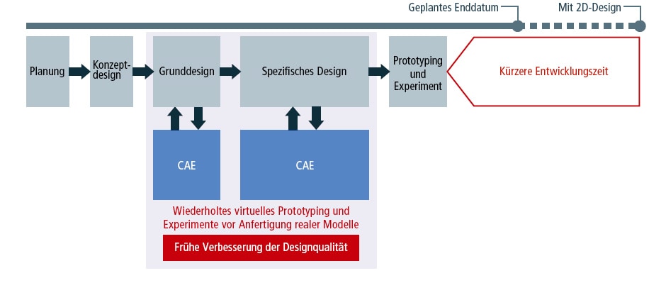 Sie können mit diesen Arten von Simulationssoftware (CAE) mögliche Probleme prognostizieren und das Design verbessern. Auf der Basis eines sorgfältig überprüften Designs lassen sich wiederum Prototypen erstellen und testen. Dies reduziert die Fehlerquote und beschleunigt die Produktentwicklung.