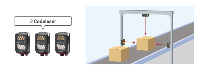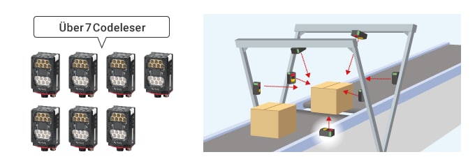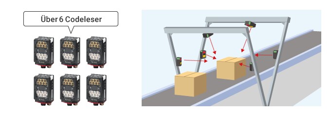 Mehrere Codeleser werden verwendet, wenn es schwierig ist, Kartons mit einem einzigen Codeleser zu scannen, z. B. wenn Strichcodes auf mehreren Oberflächen angebracht sind und wenn es unterschiedliche Kartongrößen gibt. Um das Lesen von Strichcodes zu automatisieren, muss die optimale Installation der Codeleser entsprechend der Etikettenposition, der Etikettenanzahl und der Kartonform ausgewählt werden. Bei der Zweiseiten-Lesung werden zum Beispiel die Oberseite und eine Seite des Kartons gescannt. Beim Lesen von drei Seiten werden die Oberseite und beide Seiten des Kartons gescannt. Mit einem Scan-Tunnel (Fünf Seiten) werden alle Oberflächen mit Ausnahme des Bodens gescannt. Bei der Sechsseiten-Lesung werden alle Seiten des Kartons gescannt, auch die Unterseite. Je mehr Codeleser verwendet werden, desto höher sind jedoch die Installationskosten und der erforderliche Aufwand für die Datenüberprüfung. Daher ist es wichtig, die für die Pakete am besten geeignete Methode auszuwählen.