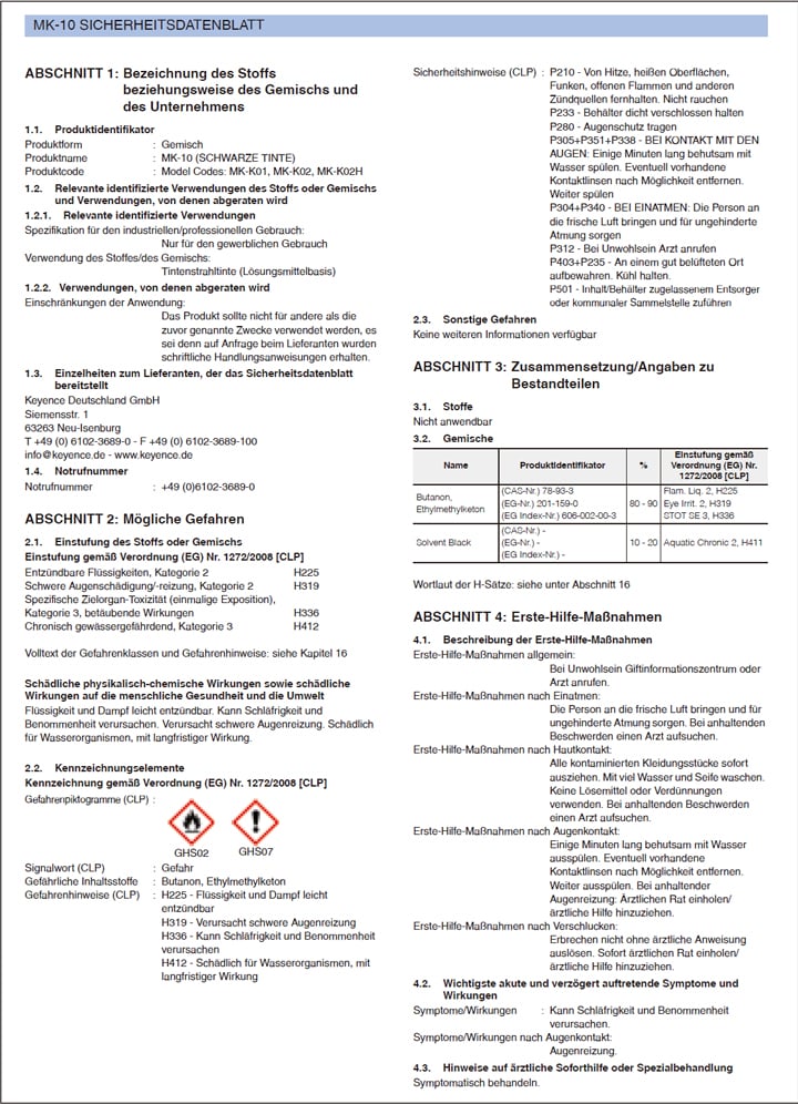 MEK (Methylethylketon) ist als Schadstoff klassifiziert, aber keine Aktivsubstanz der Tinte. Diese gilt daher laut PRTR-Vorschrift nicht als schädliche oder giftige Substanz.