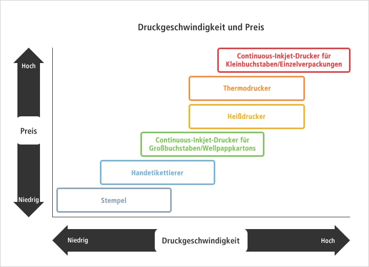In der Regel sind Drucker, einschließlich Continuous-Inkjet-Drucker, teurer als halbmanuelle Beschriftungsgeräte wie Handstempel oder Handetikettierer. Die Druckgeschwindigkeit eines Druckers ist jedoch viel höher, was eine erhebliche Steigerung des Produktionsdurchsatzes ermöglicht.Durch Einsatz eines CIJ-Druckers, können Sie Ihre Produkte schneller beschriften und somit Ihre Produktivität steigern: Kosten-Nutzen-Vorteil!