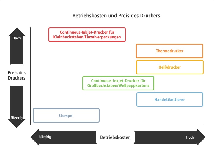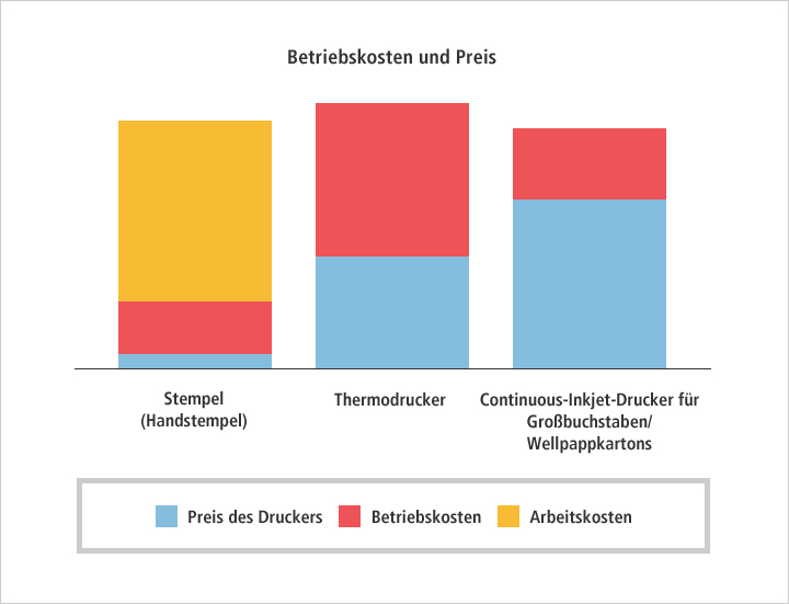 Es ist sehr üblich, dass die Betriebskosten des Druckers weit über dem Kaufpreis des Geräts liegen. Dies gilt insbesondere für Handstempel und Handetikettierer. Bei Thermodruckern sind die Farbbänder teuer, was das Betriebskostenverhältnis erhöht. Auf der anderen Seite ist der Kaufpreis bei einem Continuous-Inkjet-Drucker höher, jedoch bietet er durch die geringeren Arbeits- und Betriebskosten ein ausgezeichnetes Gesamtkostenverhältnis.