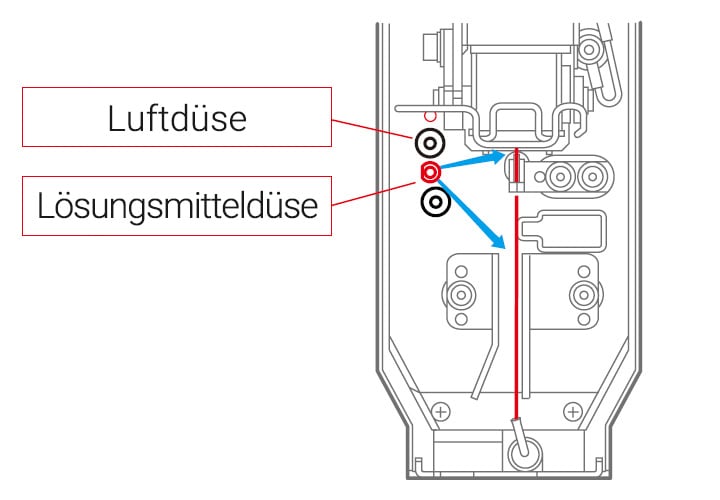 Das Lösungsmittel, das während der automatischen Reinigung beim Start, beim Abschalten und bei der Wartung verwendet wird, sammelt sich im Aufbereitungstank.
