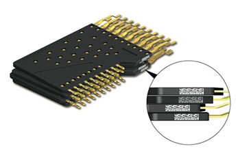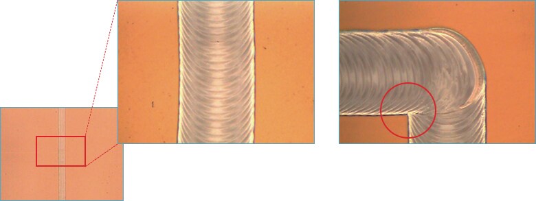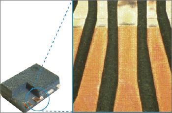 Die 3-Achsen-Laserbeschrifter von KEYENCE können die Oberflächen von IC-Chips kennzeichnen und gleichzeitig Beschichtungen oder Galvanisierungen im selben Prozess entfernen. Da der Laser mit seiner kleinen Spotweite nur entlang der schmalen Kanten des IC fährt, können Grate über den Anschlüssen entfernt werden, ohne das Innere des Gehäuses zu beschädigen.