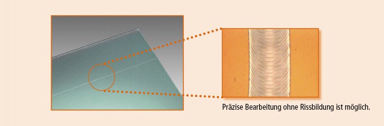 Eine Wellenlänge von 1064 nm durchdringt transparente Körper. Darüber hinaus wird bei Verwendung unserer Hybrid-Laser mit ihrer hohen Spitzenleistung und kurzen Pulsbreite (Modellreihe MD-X) die Bearbeitung exakt auf die Oberflächenbeschichtung begrenzt, sodass das Substrat nicht beschädigt wird.