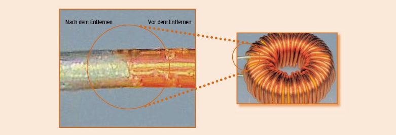 Die Ummantelung gewickelter Drähte, wie etwa bei Spulen, kann mit einem Beschriftungslaser entfernt werden. Bisher wurden generell Abbeizmittel oder geeignete Werkzeuge verwendet. Heute werden bevorzugt Beschriftungslaser eingesetzt, da für sie keine Verbrauchsmaterialien benötigt werden und sie ein zuverlässiges Resultat gewährleisten. Die hohe Spitzenleistung und die kurze Pulsbreite von YVO4-Lasern ermöglichen eine Bearbeitung mit minimalen Auswirkungen auf die darunterliegende Schicht.
