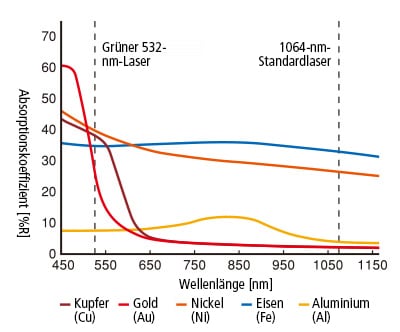 Für die Bearbeitung von Metall im Allgemeinen kann eine Wellenlänge von 1064 nm verwendet werden, die jedoch bei Kupfer einen extrem niedrigen Absorptionskoeffizienten hat. Auf diese Weise ist es möglich, bei minimaler Beeinträchtigung des Kupferkerns nur die Isolierung zu entfernen.
