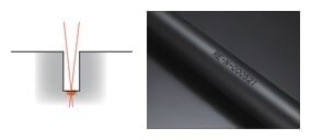 Um Rissbildung bei sehr harten Metallen, wie z. B. bei Werkzeugen, zu vermeiden, ist eine Feineinstellung der Q-Switch-Frequenz unerlässlich. Hybride Beschriftungslaser mit einer hohen Spitzenleistung und einer kurzen Impulsbreite sind hierfür am besten geeignet.