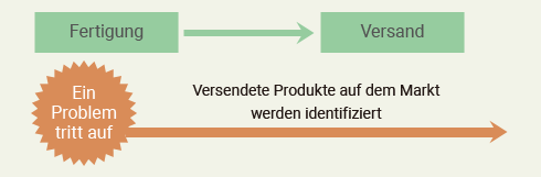 Das Vorwärtsverfolgen ist eine Aktion, bei der ein Produkt entlang der Zeitachse verfolgt wird. Wenn zum Beispiel ein Mangel an einem bestimmten Teil festgestellt wird, können Produkte, die dieses Teil enthalten, identifiziert und präzise zurückgerufen werden. Folglich eignet sie sich für Maßnahmen gegen Rückrufaktionen und mangelhafte Produkte.
