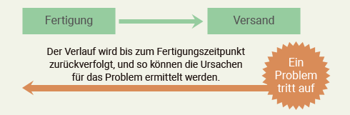 Es ist jedoch nicht sehr sinnvoll, nur Teile und Produkte zu identifizieren oder Informationen zu erfassen. Die Rückverfolgbarkeit wurde nur dann erfolgreich realisiert, wenn solche Informationen jederzeit für alle vorgelagerten und nachgelagerten Prozesse abrufbar sind. In diesem Abschnitt wird das Vorwärts- und Rückwärtsverfolgen erläutert, das beim Thema Rückverfolgbarkeit erwähnt werden muss.