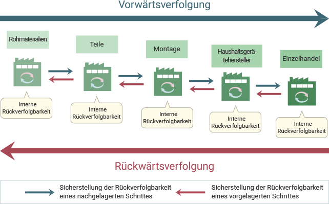 Für die lückenlose Rückverfolgbarkeit ist es wichtig, die Ströme aus dem Unternehmen heraus zu klären. Als Beispiel sei ein Unternehmen genannt, das Leiterplatten herstellt. Nehmen wir an, dass das Unternehmen Lot von mehreren Firmen gekauft hat. Ist ein Teil des gekauften Lotes mangelhaft, kann das Unternehmen den entsprechenden Lieferanten leicht identifizieren, sofern die Möglichkeit der einstufigen Rückverfolgung vorgelagerter Prozesse gewährleistet ist. Ist zudem die Möglichkeit der einstufigen Rückverfolgbarkeit von nachgelagerten Prozessen gewährleistet, kann das Unternehmen die mit diesem Lot hergestellten Leiterplatten durch genaue Angabe der Zielorte abrufen, um so den Verlust zu minimieren.