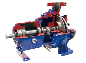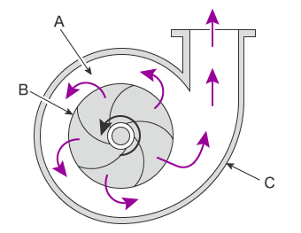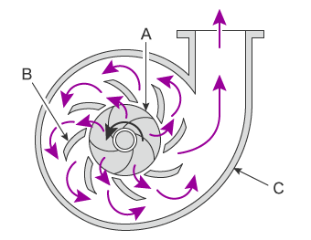 In einer Spiralgehäusepumpe strömt die Flüssigkeit in das Laufrad im Inneren des Gehäuses, wird durch die Zentrifugalkraft unter Druck gesetzt und so die Flüssigkeit befördert. Die Flüssigkeit, die aus dem rotierenden Laufrad austritt, verlangsamt sich allmählich, während sie durch das Gehäuse fließt und diese Geschwindigkeit wird in Druck umgewandelt. Diese Pumpe wird in Anlagen mit relativ geringen Hubhöhen wie 20 m oder weniger eingesetzt.