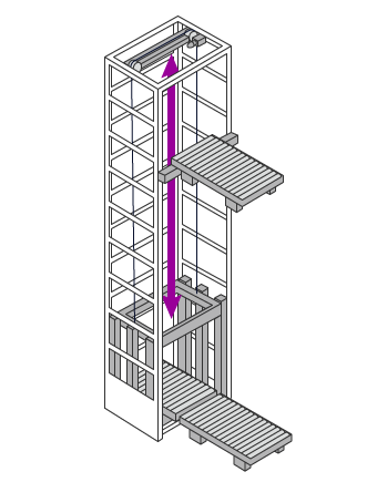 Eine vertikale Transfermaschine ist ein Gerät, das in Gebäuden wie Logistikzentren und Produktionsstätten installiert wird, um Lasten vertikal zu transferieren. Sie unterscheidet sich von einem Lastenaufzug dadurch, dass sie nicht den im japanischen Baunormengesetz vorgeschriebenen Aufzugssystemen entspricht und daher keinen Antrag auf Baubestätigung, keine Genehmigung des Arbeitsnormenbüros, keine regelmäßigen Inspektionen und Berichte nach der Installation oder Ähnliches erfordert. Da sie auf den Transport von Lasten spezialisiert ist, kann sie dies mit höherer Geschwindigkeit tun und bildet so ein effizientes Transfersystem in Kombination mit Transfermaschinen für die Lagerung und den Versand. Daher werden viele dieser Maschinen in Logistikzentren, Produktionsstätten und ähnlichen Orten aufgestellt.