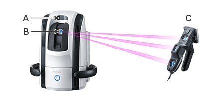 Die Tracking-Kamera der Modellreihe WM verfolgt den Messtaster, um seine Position und Ausrichtung mit hoher Genauigkeit zu bestimmen. Die Positions-Kamera verfolgt das von der kabellosen Sonde ausgestrahlte Licht zu jeder Zeit. Daher kann die Position des Messtasters sofort erkannt werden, egal wo sich der Messtaster innerhalb des großen Messbereichs befindet.