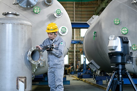 Um diese Probleme zu lösen, werden in immer mehr Fällen die neuesten 3D-Koordinatenmessgeräte (KMG) eingesetzt. Das Mobile 3D-Koordinatenmessgerät der Modellreihe WM von KEYENCE ermöglicht eine hochpräzise Maßhaltigkeitsprüfung von großen Vakuumkammern durch eine einzige Person mit dem kabellosen Messtaster. Selbst vertiefte Bereiche von Messobjekten können ohne Bewegungseinschränkungen innerhalb des Messbereichs erreicht werden, was die Messung durch einfaches Antasten des Messobjekts mit dem kabellosen Messtaster ermöglicht. Darüber hinaus ist die Modellreihe WM tragbar und ermöglicht Messungen an beliebigen Punkten zu beliebigen Zeitpunkten, sei es in der Fertigung oder auf der Baustelle. Im Gegensatz zu Messungen mit Handmessmitteln variieren die gemessenen Werte nicht, was eine quantitative Messung ermöglicht.