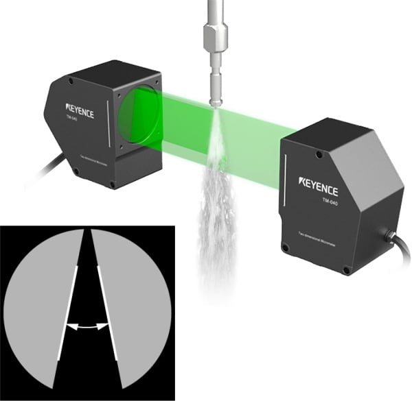 Dann präsentierte uns KEYENCE das 2D-Lichtbandmikrometer der Modellreihe TM. Wir probierten die Messung mit einem Testgerät und waren überrascht, auf welch einfache Weise Winkel und Form der fließenden Flüssigkeit gemessen werden konnten.