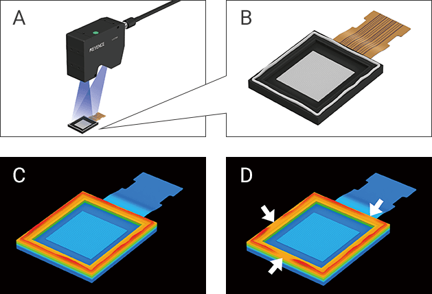 Formprüfungen auf Basis der 3D-Bildverarbeitung, die den 2D/3D Laser-Profilsensor der Modellreihe LJ-V7000 und ein Bildverarbeitungssystem kombinieren, ermöglichen eine genaue Prüfung nicht nur der Breite oder des Fehlens von Klebstoff, sondern auch der Höhe, was bei bisher eingesetzten Vision-Sensoren schwierig ist. Die extrem schnelle Abtastfrequenz von 64.000 Zyklen/Sekunde kann auch für die Inline-Prüfung bei kurzen Taktzeiten geeignet sein.