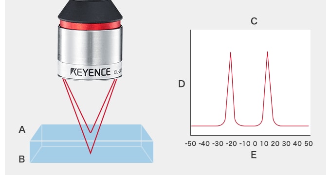 Darüber hinaus kann die Modellreihe CL-3000 Ober- und Unterseite von transparenten Objekten mit einer Dicke von 15 μm oder mehr (z. B. Glassubstrate, transparente Folien und dünne Schichten aus transparenten Materialien) genau unterscheiden, was eine Höhen-(Abstands-)Messung ermöglicht.