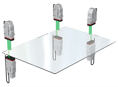 Dadurch kann eine präzise, gleichzeitige Messung des Abstandes von der Schlitzdüse zur Oberfläche des Glassubstrats und der Dicke des Substrats vorgenommen werden. Eine hochpräzise Beschichtung aufrecht zu erhalten ist auch möglich, indem die Messergebnisse zur Höhenkontrolle an die Geräte gesendet werden.
