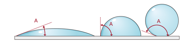 Wenn der in der Abbildung als A dargestellte Kontaktwinkel θ näher an 0 liegt, ist die Benetzbarkeit höher.