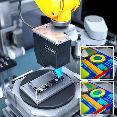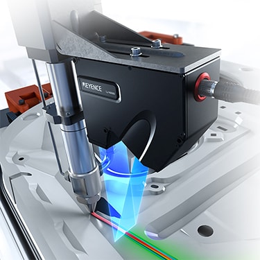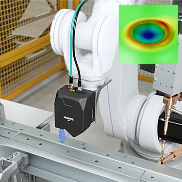 Punktschweißungen können auf ihre Form und Qualitätsmerkmale geprüft werden. Der Sensorkopf kann an einem Roboter montiert werden und ermöglicht so Inspektionen aus verschiedenen Winkeln und an unterschiedlichen Stellen. Darüber hinaus ermöglicht der eingebaute Scan-Mechanismus eine stabile Prüfung, bei der die Vibrationen und die Linearität des Roboters außer Acht gelassen werden können.
