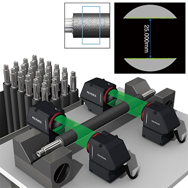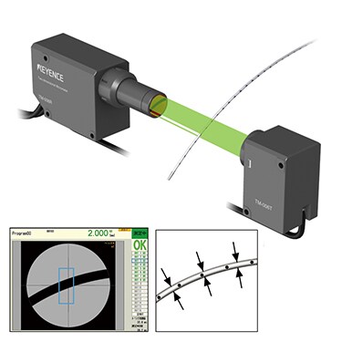 Das Ziel wird durch einen Strahl von gleichförmig, parallelisierten Licht geführt, um den durch eine telezentrische Optik gebildeten Schattenwurf zu messen. Der Außendurchmesser kann mit hoher Präzision gemessen werden, indem das Messsystem ausgewählt wird, das am besten zum Ziel-Durchmesser passt. Eine schnelle Abtastrate gewährleistet eine stabile Messung, selbst wenn es zu einem Rundlauf des Ziels kommt.