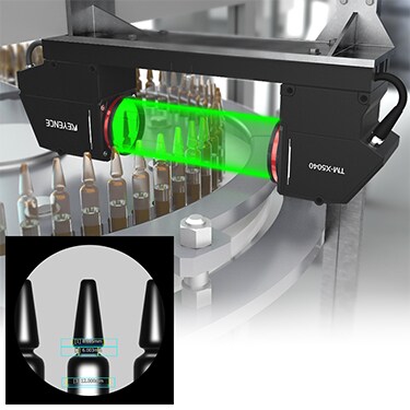 Mit 2D Durchlicht Messsystemen ist es möglich, den minimalen und maximalen Durchmesser eines Ziels aus einem einzigen aufgenommenen Bild zu messen. Die Modellreihe TM-X arbeitet, indem sie die Silhouette eines Ziels mit einem telezentrischen optischen System erfasst, sodass sie Objekte aus jedem Material (einschließlich transparenter Ampullen) genau messen kann. Selbst wenn das Ziel geneigt ist, kann der Außendurchmesser mithilfe der Positionskorrektur genau gemessen werden.