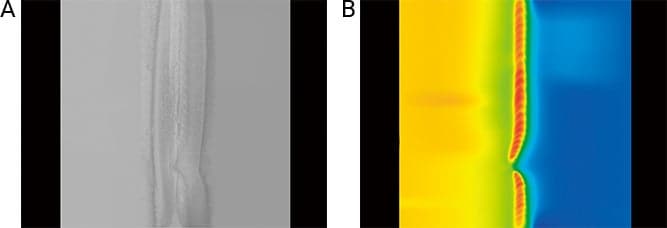 Die Modellreihe LJ-V7000 verfügt über einen blauen Laser und ist mit einem Bandpassfilter ausgestattet, der nur Licht mit einer Wellenlänge von etwa 405 nm durchlässt. Dies ermöglicht auch die Messung von heißen Messobjekten unmittelbar nach dem Schweißen, ohne von Wellenlängenanteilen zwischen Rot und Infrarot beeinträchtigt zu werden.