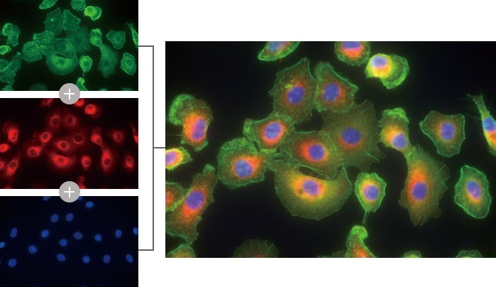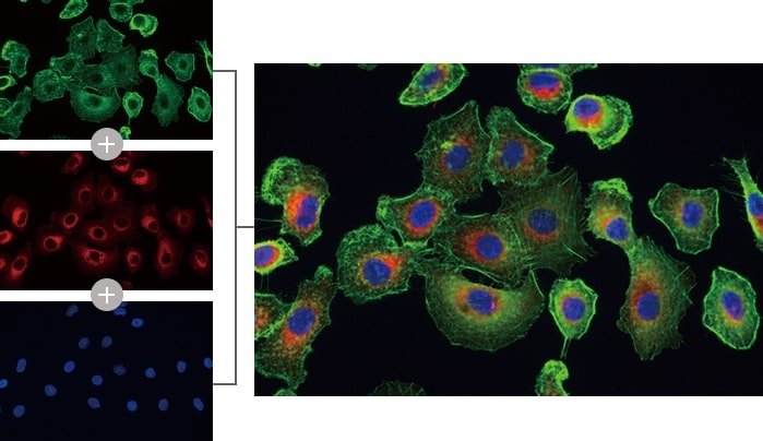- Bei der Betrachtung von mehrfarbigen Zellen können Bilder von bis zu vier fluoreszierenden Kanälen zu einem Bild überlagert werden.
