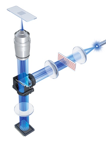 * Der optische Sectioning-Algorithmus verwendet strukturierte Beleuchtung, um die Analysebereiche abzuteilen (z-Sectioning). Anregungslicht aus einer Halogen-Metalldampflampe, das einen breiten Wellenlängenbereich vom UV- bis zum Nahinfrarotbereich aufweist, wird durch ein elektronisches Projektionselement geleitet, das das Licht in einem Gittermuster auf die Probe projiziert (strukturierte Beleuchtung). Das Gitter wird nur auf die fokussierten Bereiche der Probe projiziert. Das BZ-X nimmt mehrere Bilder auf, während es das Gitter in Z-Richtung bewegt. Indem es aus diesen Bildern nur die Bereiche extrahiert, auf die das Gitter projiziert ist, verhindert es den Effekt der Fluoreszenzunschärfe in vertikaler Richtung. Dieser Algorithmus erzeugt automatisch klare Bilder, die selektiv nur aus den Signalen der fokussierten Bereiche bestehen.