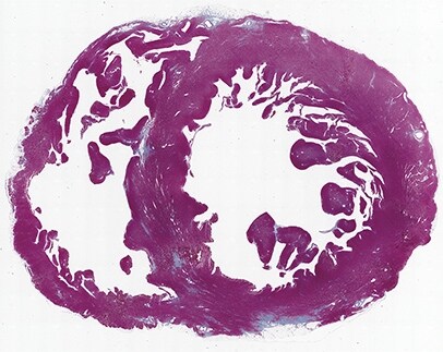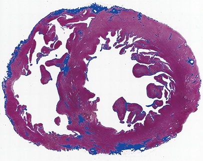 - Mit der Software für die hybride Zellzählung werden aus dem gesamten Bereich nur fibrotische Flächen extrahiert und der Anteil automatisch berechnet.
