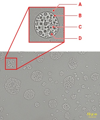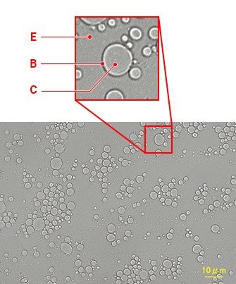 - Durch die Verwendung des hochauflösenden Ölimmersionsobjektivs (100x) mit der geringsten Aberration bietet das BZ-X eine hochauflösende Betrachtung selbst kleinster Konturen und genauer Profile der inneren Wasserphase von Doppelemulsionen.