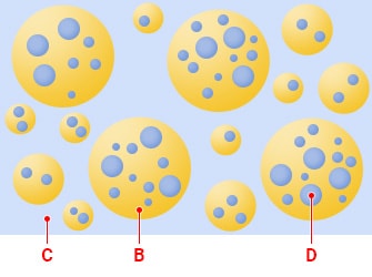 Eine Emulsion ist ein kolloidales Dispersionssystem, bei dem größere Tröpfchen des Dispersionsmaterials im Dispersionsmedium verteilt sind. Dispergierte flüssige Materialien sind in einem flüssigen Dispersionsmedium dispergiert, ohne sich ineinander aufzulösen. Der Vorgang der Bildung einer Emulsion aus zwei Flüssigkeiten wird als Emulgieren bezeichnet. Im Allgemeinen wird ein Tensid (Emulgator), das sowohl hydrophile als auch lipophile Eigenschaften hat, verwendet, um den instabilen emulgierten Zustand zu stabilisieren.