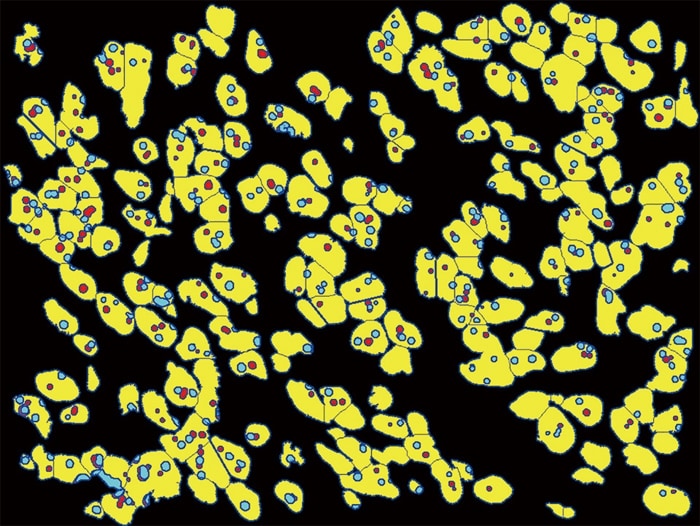 - Mit der hybriden Zellzählung lassen sich bestimmte Zellkerne als Auswahlbereich festlegen werden, innerhalb dessen die Chromosomen jedes einzelnen Zellkerns gezählt werden sollen.