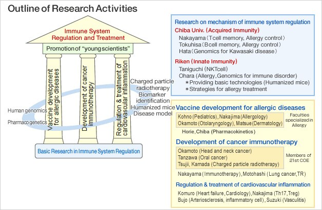 Während sich die beiden Fakultäten der Universität Chiba mit der Erforschung von Therapeutika durch erworbene Immunität befassen, arbeitet RIKEN an Therapeutika durch natürliche Immunität. Bisher konzentrierte sich die Immunitätsforschung auf die erworbene Immunität, aber die Bedeutung der natürlichen Immunität wurde in den letzten Jahren erneut bekräftigt. Durch enge Zusammenarbeit haben die von der Chiba-Universität und RIKEN durchgeführte Forschung fortschrittliche Therapeutika hervorgebracht, die auf beiden Immunreaktionen basieren.