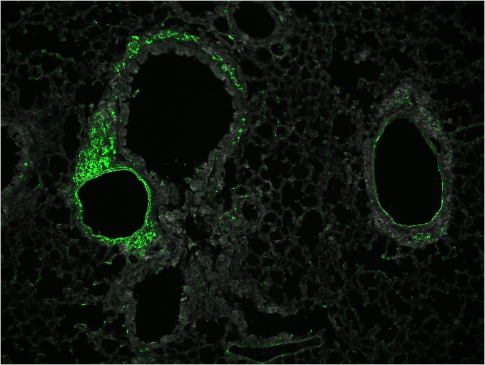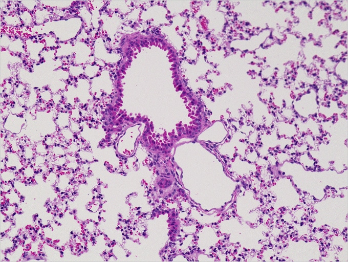 Um pathologische Asthmamodelle bei Mäusen zu beobachten, muss man die gesamte Lunge betrachten und wichtige Bereiche für die Beobachtung vergrößern. Die Navigationsfunktion der Modellreihe BZ ist für solche Einsätze sehr nützlich. Damit können vergrößerte Bilder eines beliebigen Bereichs des Gesamtbildes, welches mit einem Objektiv mit geringer Vergrößerung aufgenommen wurde, angezeigt werden, indem der Benutzer nur auf diesen Bereich klickt. Dr. Iwamura erläutert den Vorteil der Modellreihe BZ: „Bei anderen Mikroskopmodellen nahm die Betrachtung zu viel Zeit in Anspruch und es gab viele unnötige Arbeiten. Mit der Modellreihe BZ jedoch können Sie den gewünschten Bereich mühelos betrachten.“